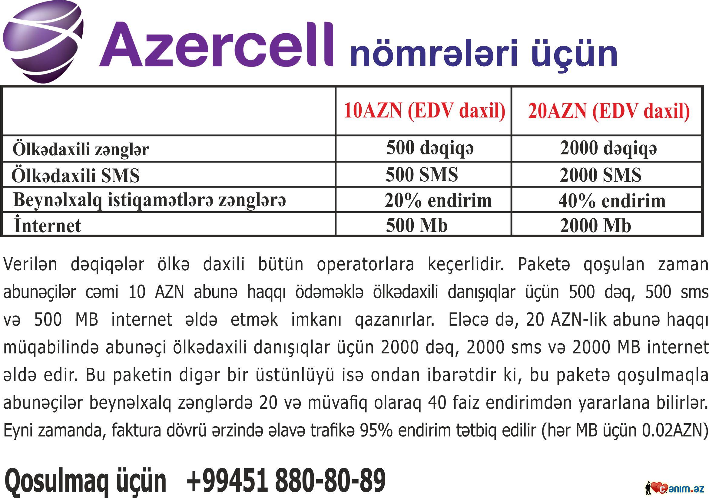 AZERCELL NOMR'ELERI UCUN ..Verilən dəqiqələr ölkə daxili bütün operatorlara keçerlidir. Paketə qoşulan zaman abunəçilər cəmi 10 AZN abunə haqqı ödəməklə ölkədaxili danışıqlar üçün 500 dəq, 500 sms və