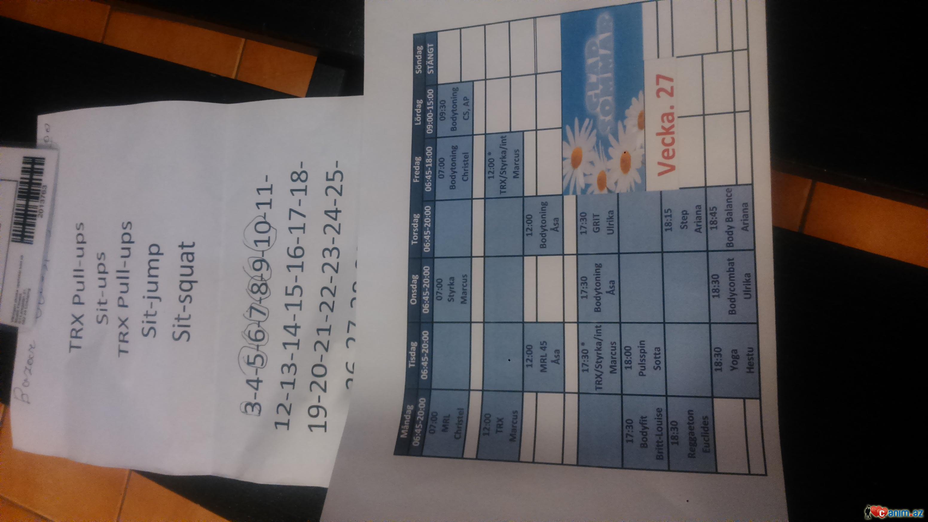 Nik_tapmiram*, Ferqli gunde Ferqli mewqler olur. Heftenin gunleri ve saatlarina gore. Ferqlide muellimler olur. Ştanq, Boks ip dartma, dans, velosiped. Squat ve saire. Yorqun olanda bir gunde bir ged