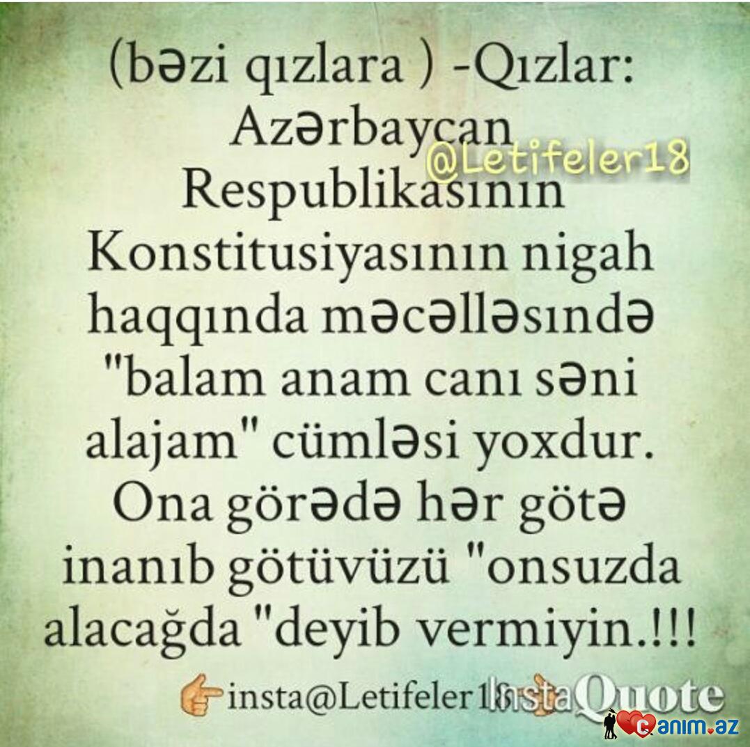 Oglanlar yeni kişiler her şeyi bilse bele siz qadınların meqamın anlaya bilmez. ALLAH SUBHAN TAALA siz qadınlara ele bir meqam verib ki, bu bize verilmeyib.. Nedir ooo?? Deyim bilin CENNET. B