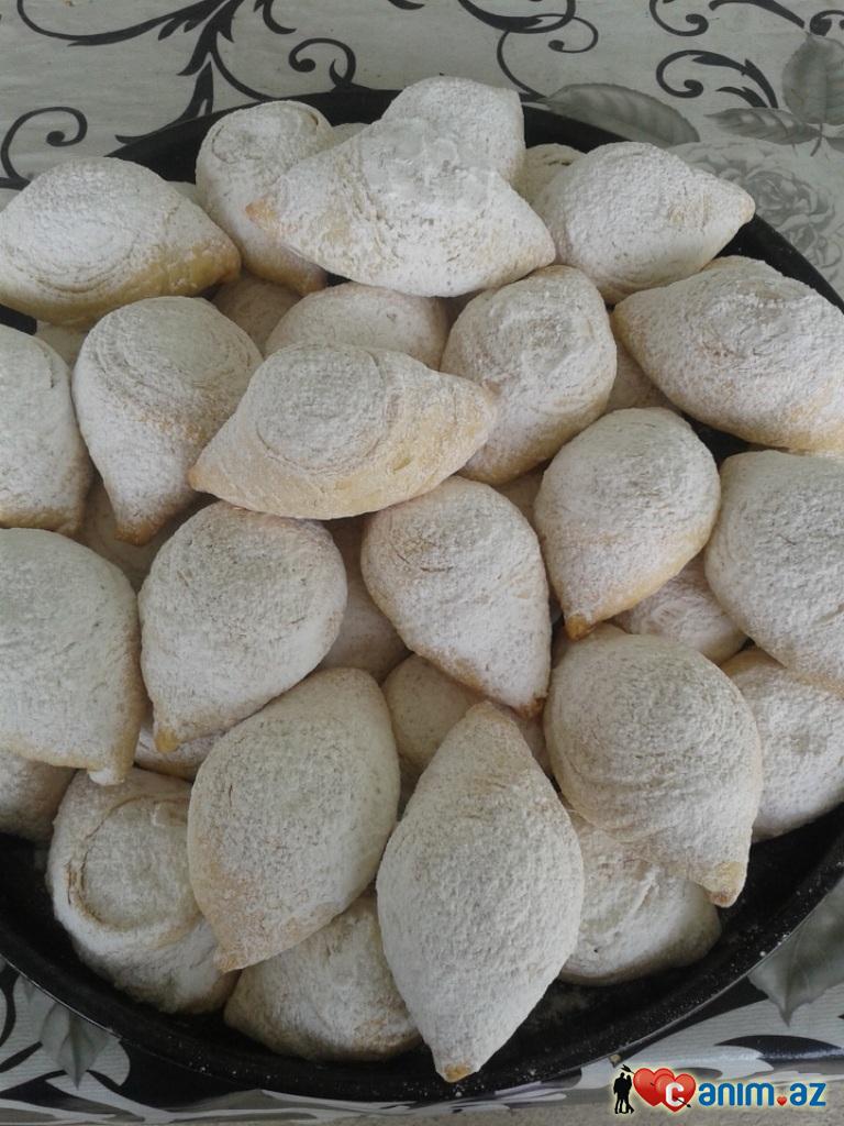evvelce mayani hazirlayin 0,5st isti sud ve ya suyun icine 2x/q pesok 1c/q maya tokub qarisdirin qoyun bir kenara kopuklenib qalxana kimi gozleyin sonra xemir ucun erzaqlari ve duzeltdiyiniz mayani elave edib yumsaq xemir yogurub acimaga qoyun bir defe aciyandan sonra birde yogurun xemir yeniden gelsin sonra 8-9kunde edib ola bildiyince nazik yayin her layin arasini yaglayin sonra rulet kimi bukub bicaqla bolun bir terefini elinizle quyu duzeldib iclik tokub bukun bezek hissesi uste qalacaq sekilde bisirin:)