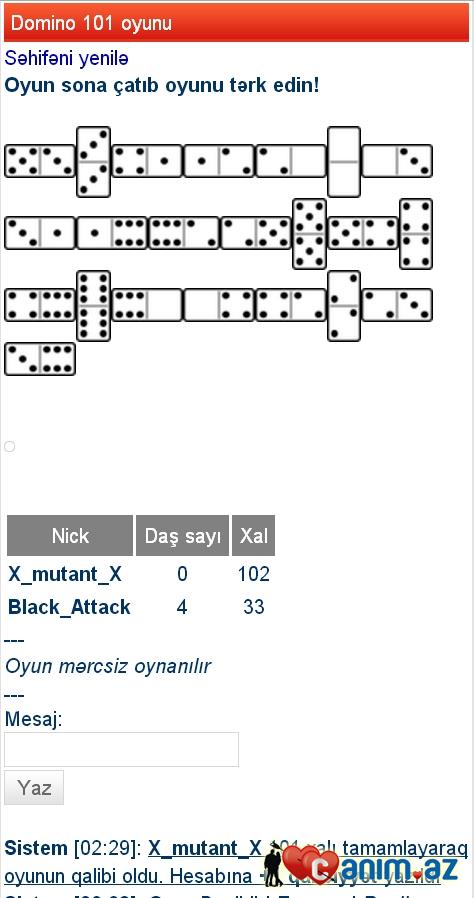 Yaşıl görsəndi məndə gəldim. Bağlamazdun oyunu mən neyniyim? Get dərdivi Telmana denən ki nöş belə başdan xiyar oyun qurub. Düzəltsin oyunu. O uje mənim problemim deyilki oyunda defekt var. Fakt onsuzda şot ortadadı 88 - 33 şaqqalıyırdım səni. Düzə düz əyriyə əyri.deyiş. X_mutant_X (10.02 /02:37) [1]