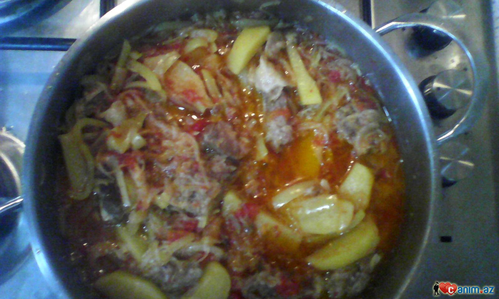 Adsiz)))et qaynadmiwdim. Bilmedim neymim. Isdide sulu yemek getmir. Birce dene kartowka vurdum ozume gore et yiye bilmirem. Sogani bol. Pomidir biber yagda qovurdum. Sulu yimey dor. Tavadi o