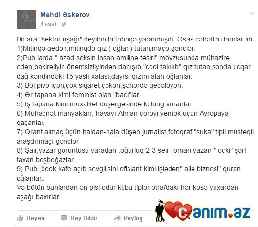 Bizdə müxalifət Qiyas Ibrahimovun vəziyyətindədi. Bir " Qul bayramınız mübarə" yazısınA görə 24 yaşlı gəncə 10 il cəza verirlərsə və ya iqtidara qarşı söz dedik də həmin adamın evindən tank, cibindən