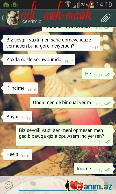 Rehmettiyin_Nevesi (21.07.2013/14:49)Bax bu hereketinize hec haqq qazandirmiram. Duzgun deyil bawqa qizla olan sohbetiniz gelib burda paylawmaqiniz