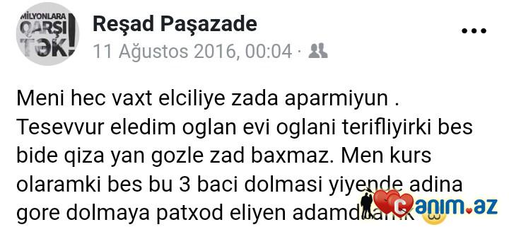 Zeqqumagaci (02.07.2018/18:54)Məm sözümü feysdə status olduğun bilmirdim)))